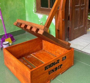 Alat ini dibuat dari limbah renovasi rumah yang sudah tidak terpakai, seperti kayu Kalimantan dan kayu papan, yang kemudian dirakit dan disambungkan menggunakan beberapa engsel.