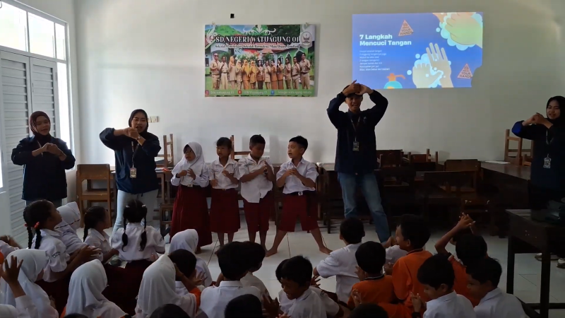 Sosialisasi dikemas secara menarik dan interaktif, di mana siswa diajak mempraktikkan langsung tujuh langkah mencuci tangan menggunakan sabun dan air mengalir.