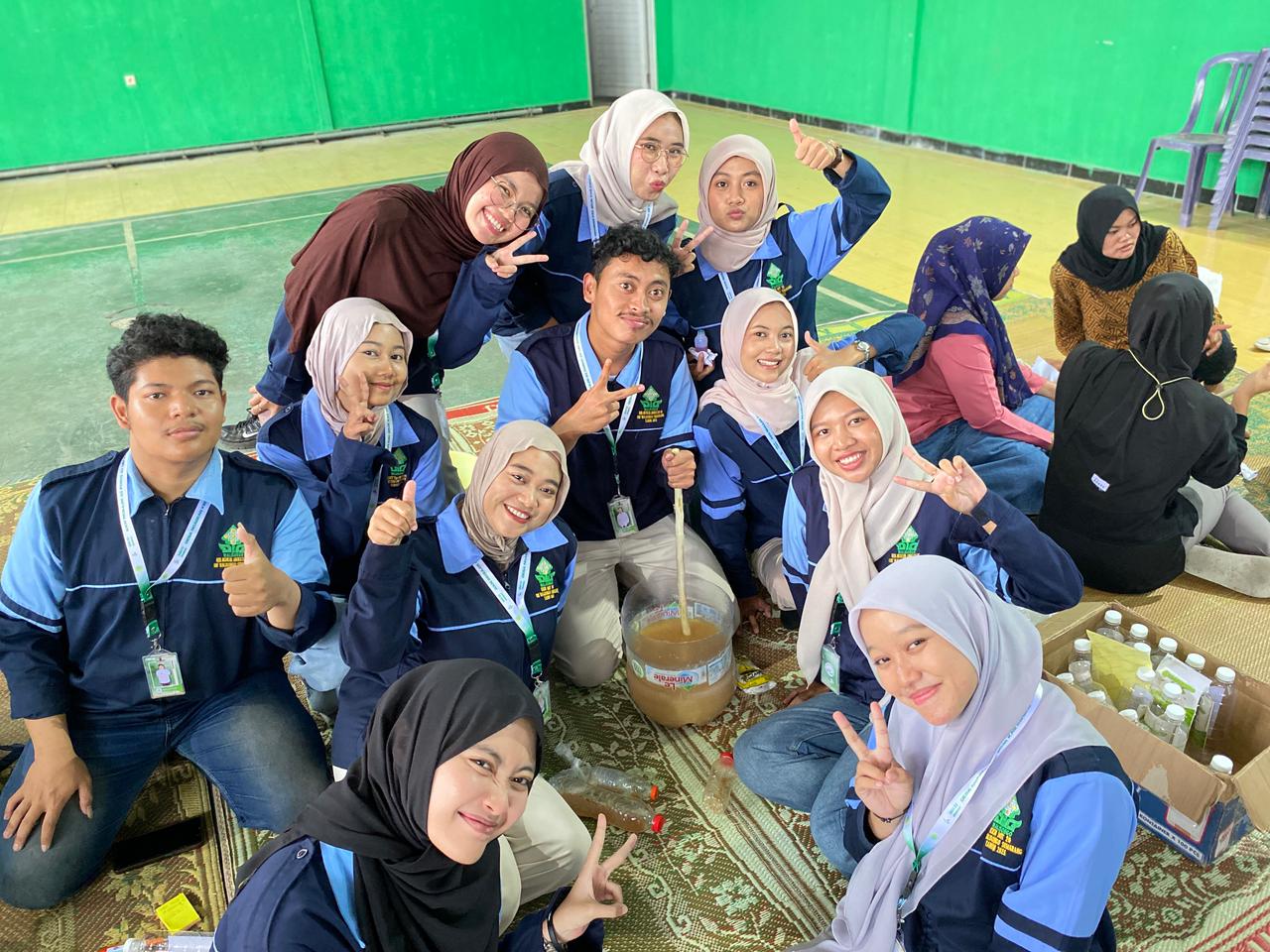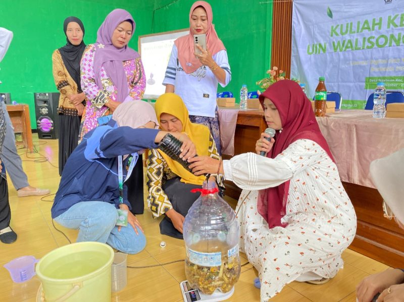 Setelah penyampaian materi, peserta diajak mempraktikkan langsung cara membuat eco-enzyme mulai dari mencampur bahan, menutup fermentor dengan plester, memberi lima tusukan jarum agar tidak meledak, hingga memberi label tanggal pembuatan dan panen.