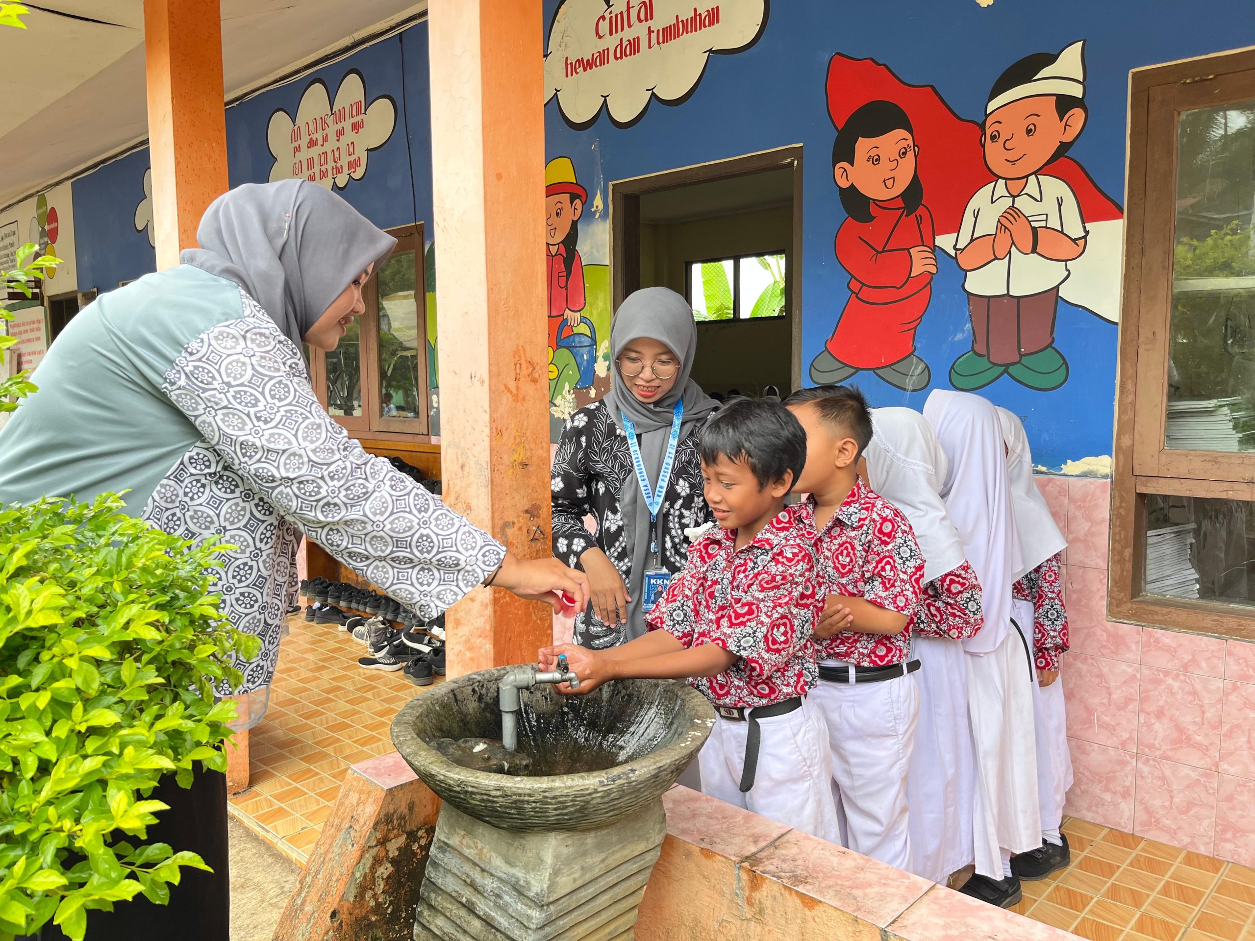 Siswa terlihat antusias mengikuti setiap langkah, mulai dari menggosok telapak tangan hingga membilas dengan benar.