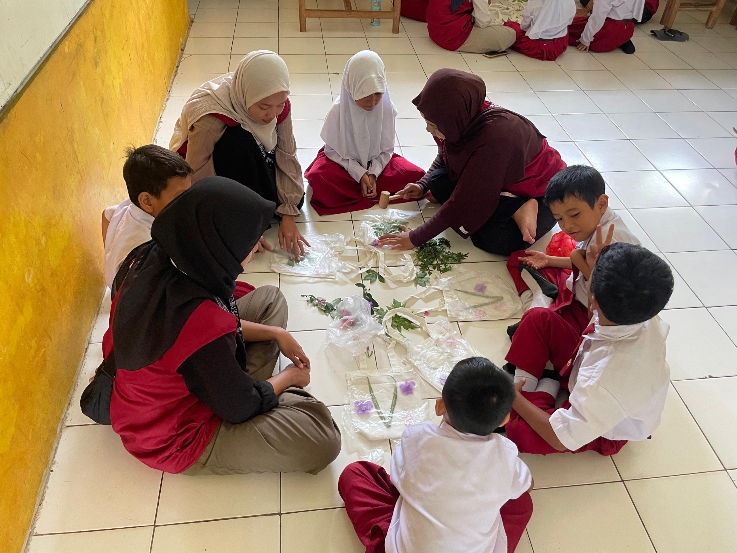 Setiap siswa berhasil mewarnai satu buah totebag dengan motif ecoprint unik hasil kreasi mereka sendiri. Motif-motif tersebut menampilkan beragam bentuk dan warna alami yang menunjukkan eksplorasi kreativitas masing-masing anak.