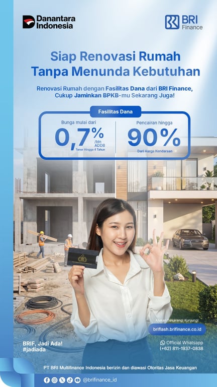 Menjawab dinamika tersebut, PT BRI Multifinance Indonesia (“BRI Finance”) menghadirkan solusi pembiayaan melalui fasilitas dana, BRI Flash, berbasis jaminan BPKB kendaraan. Produk ini dirancang untuk memberikan akses pendanaan yang lebih fleksibel dengan proses yang efisien, sehingga masyarakat dapat merealisasikan kebutuhan renovasi secara lebih terencana.